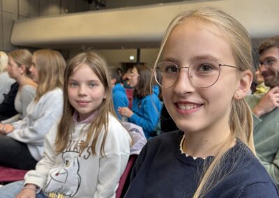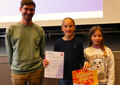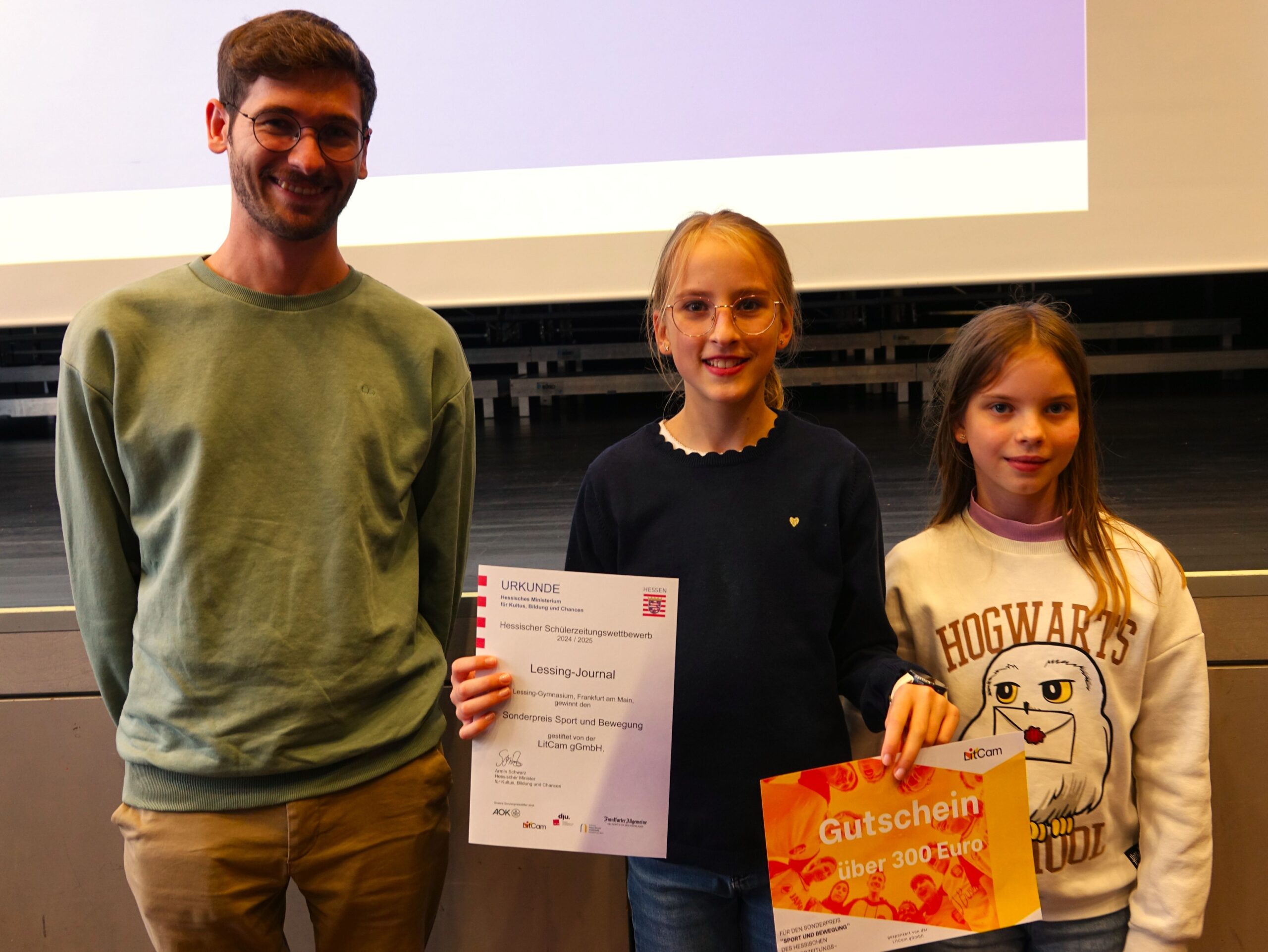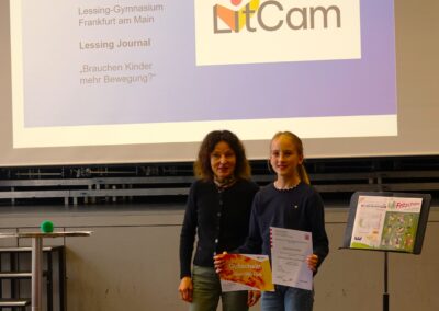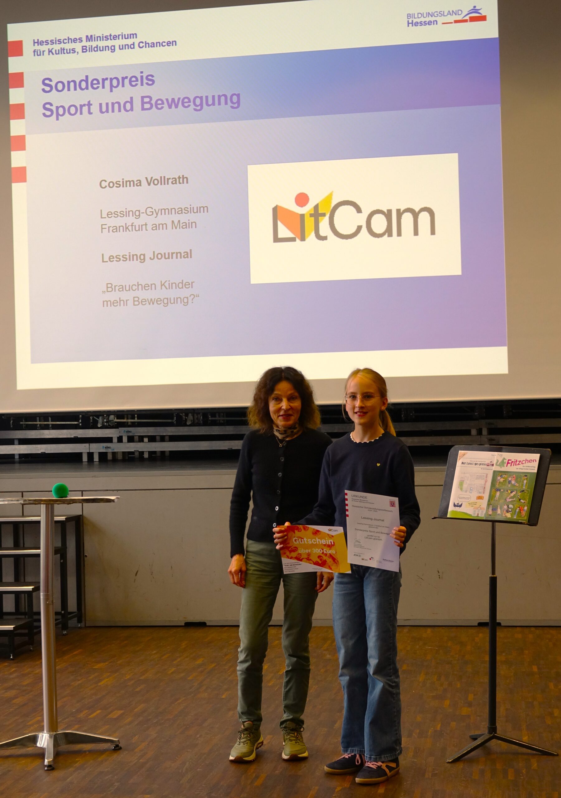 Sol­ches Enga­ge­ment öffent­lich zu wür­di­gen und junge Autorin­nen und Autoren in ihrer Arbeit zu bestär­ken, hat sich der Hes­si­sche Schü­ler­zei­tungs­wett­be­werb zur Auf­gabe gemacht. Die­ses Jahr war die Les­sing­schü­le­rin Cosima Voll­rath eine der Preis­trä­ge­rin­nen. Für ihren Arti­kel “Brau­chen Kin­der mehr Bewe­gung?”, den sie bereits als Fünft­kläss­le­rin für unsere Schü­ler­zei­tung “Les­sing Jour­nal” geschrie­ben hat, erhielt sie am Mitt­woch, dem 24.09.2025, bei der dies­jäh­ri­gen Lan­des­preis­ver­lei­hung einen Son­der­preis in der Rubrik “Sport und Bewe­gung”. Der mit 300 Euro dotierte Preis wurde von der Lit­cam gGmbH gestif­tet. In der klei­nen Lau­da­tio (= Lob­rede) hob die Jury posi­tiv her­vor, wie es Cosima gelun­gen sei, nicht nur das Pro­blem der man­geln­den Bewe­gung bei Kin­dern und Jugend­li­chen zu benen­nen, son­dern auch Rat­schläge zu geben. Wei­ter­hin wurde die Art und Weise gelobt, wie die Autorin wis­sen­schaft­li­che Erkennt­nisse in ihren Text inte­griert habe. Ins­ge­samt habe der Text über­zeu­gend ver­an­schau­licht, warum Bewe­gung für junge Men­schen wich­tig sei.