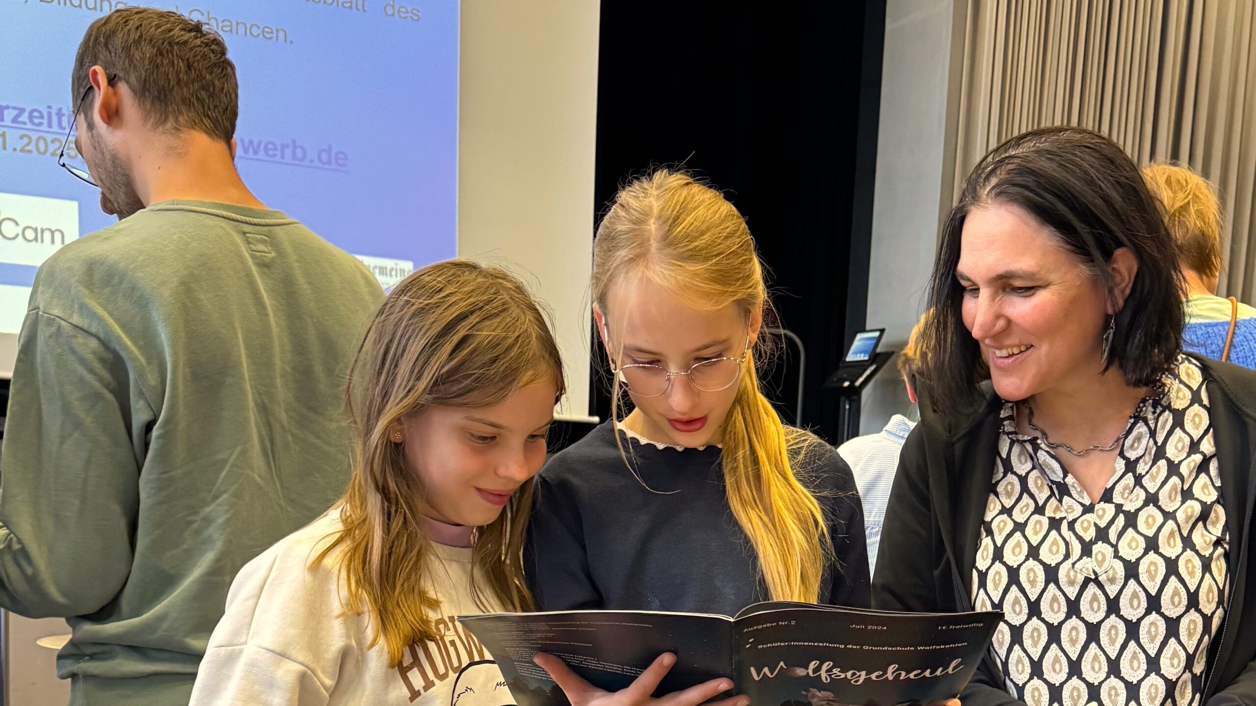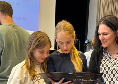 Dank gebührt ebenso dem Lei­ter der AG Schü­ler­zei­tung, Herrn Schunk, der den Schü­le­rin­nen und Schü­lern durch seine Arbeit sol­che Erleb­nisse und Erfolge ermög­licht. Als Unter­stüt­zer und Unter­stüt­ze­rin­nen waren zur Preis­ver­lei­hungs-Ver­an­stal­tung im Goe­the-Gym­na­sium Frank­furt neben Cosi­mas Eltern auch ihre Freun­din Kris­tin und der stell­ver­tre­tende Chef­re­dak­teur des “Les­sing Jour­nals”, Arjen (E‑Phase), gekom­men, wie auch Herr Schä­fer in Ver­tre­tung für Herrn Schunk.