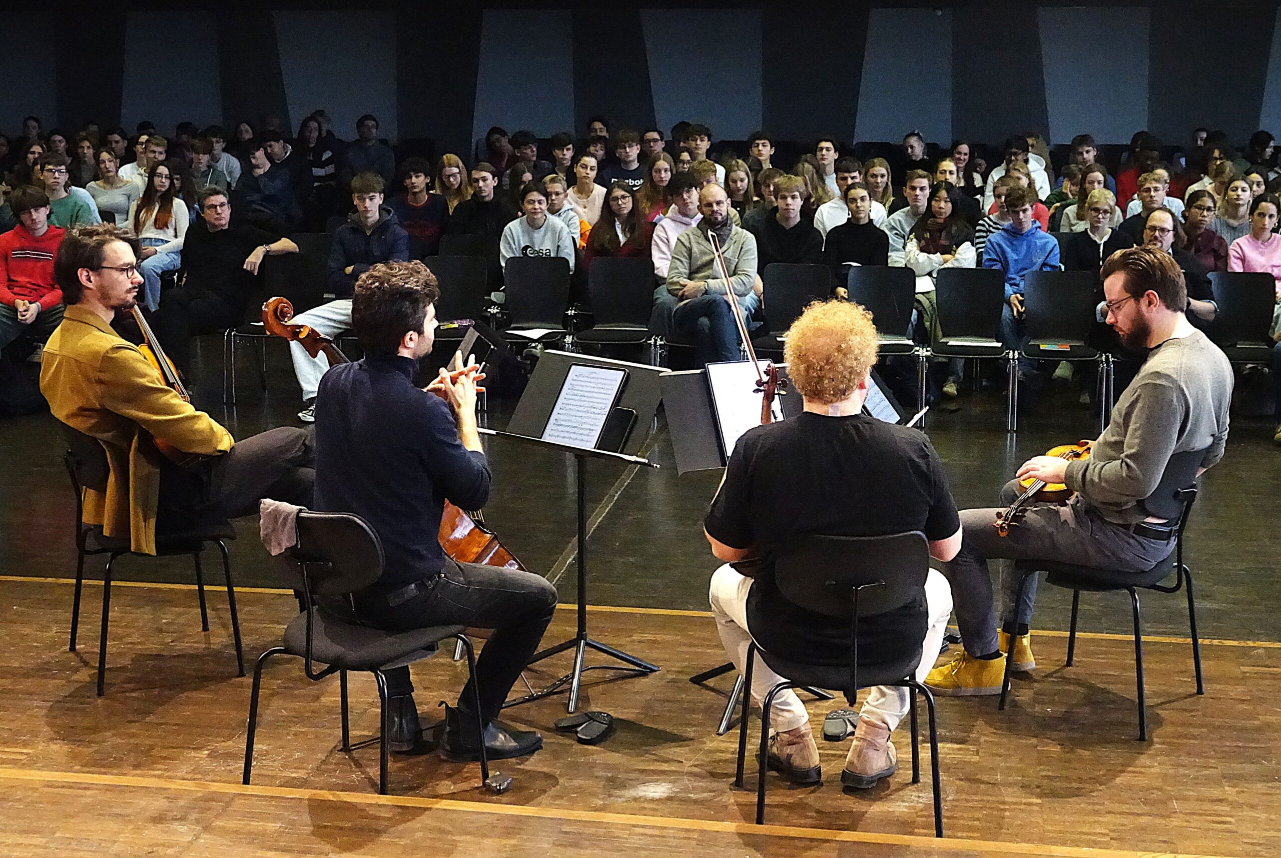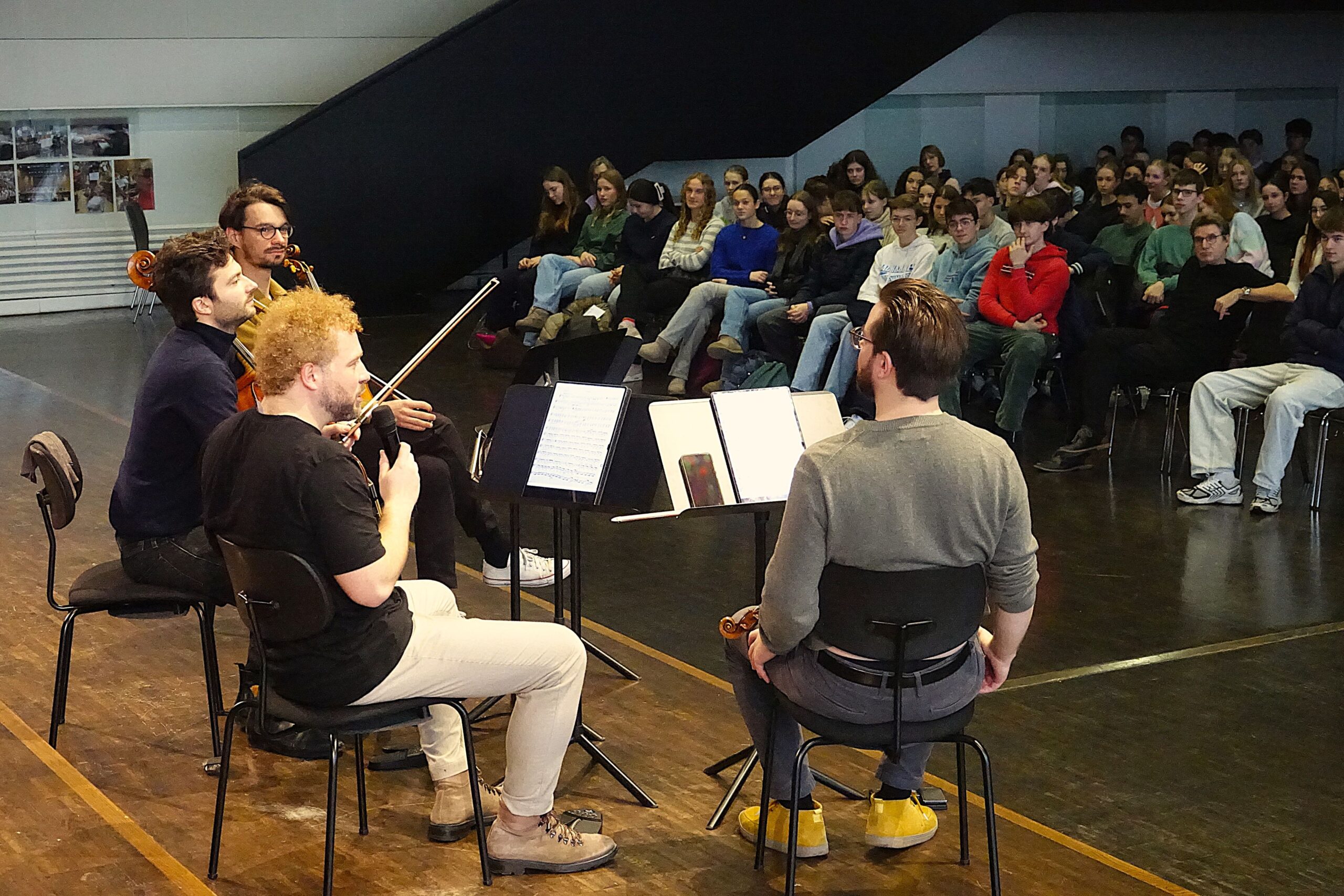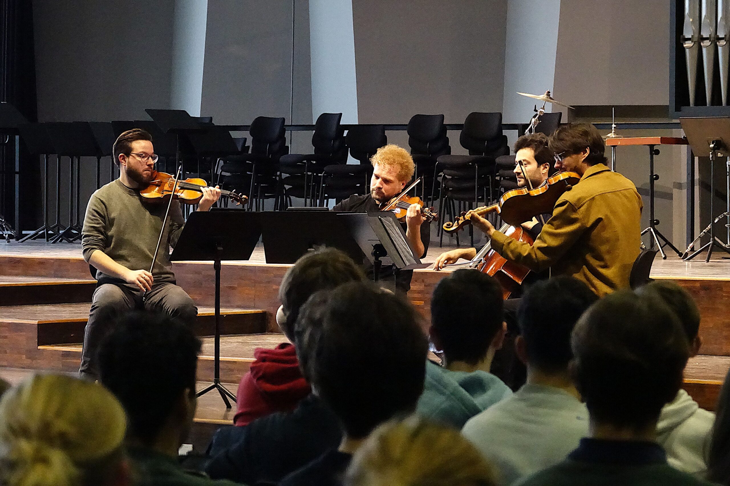 Als die Mitglieder des “Goldmund Quartetts” ihr Ensemble vor 16 Jahren als Oberstufenschüler einer Münchner Schule gründeten, waren sie ungefähr so alt wie ihre Zuhörer/innen beim Vortrag am 11. Dezember in der Aula des Lessing-Gymnasiums.