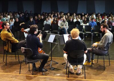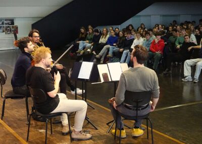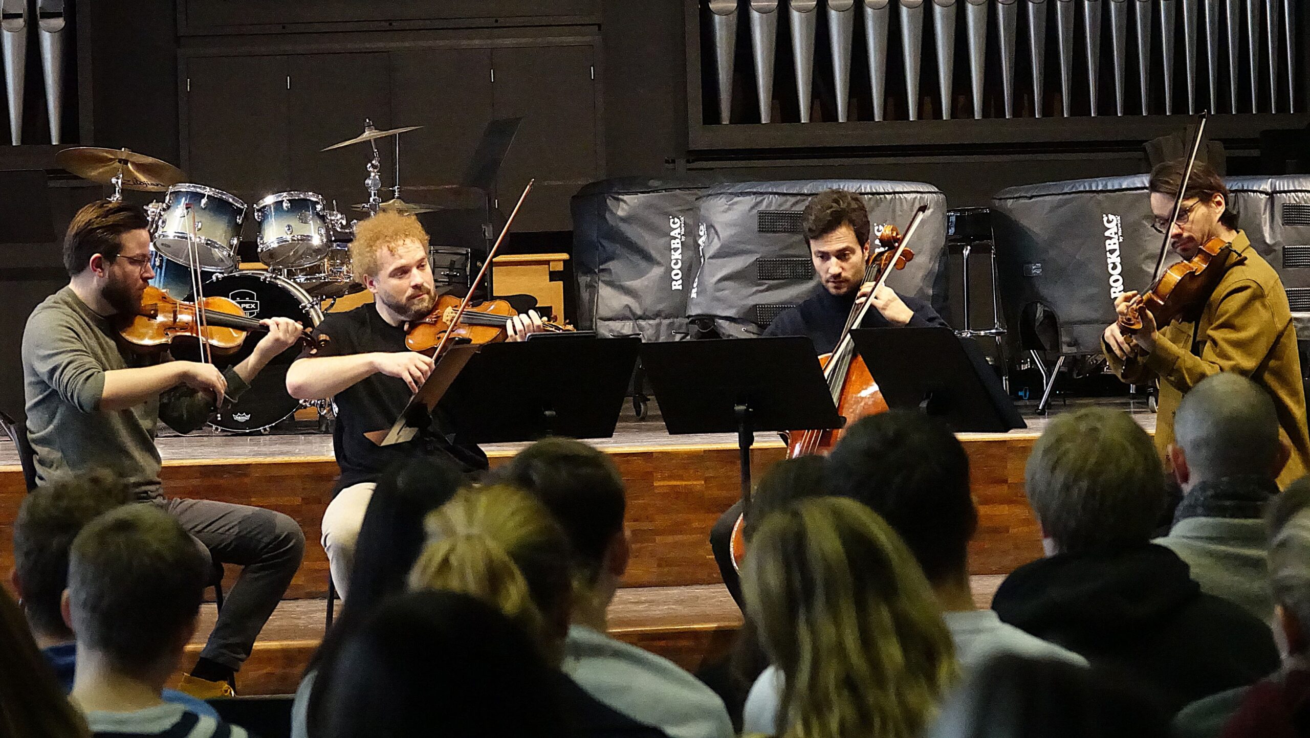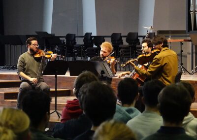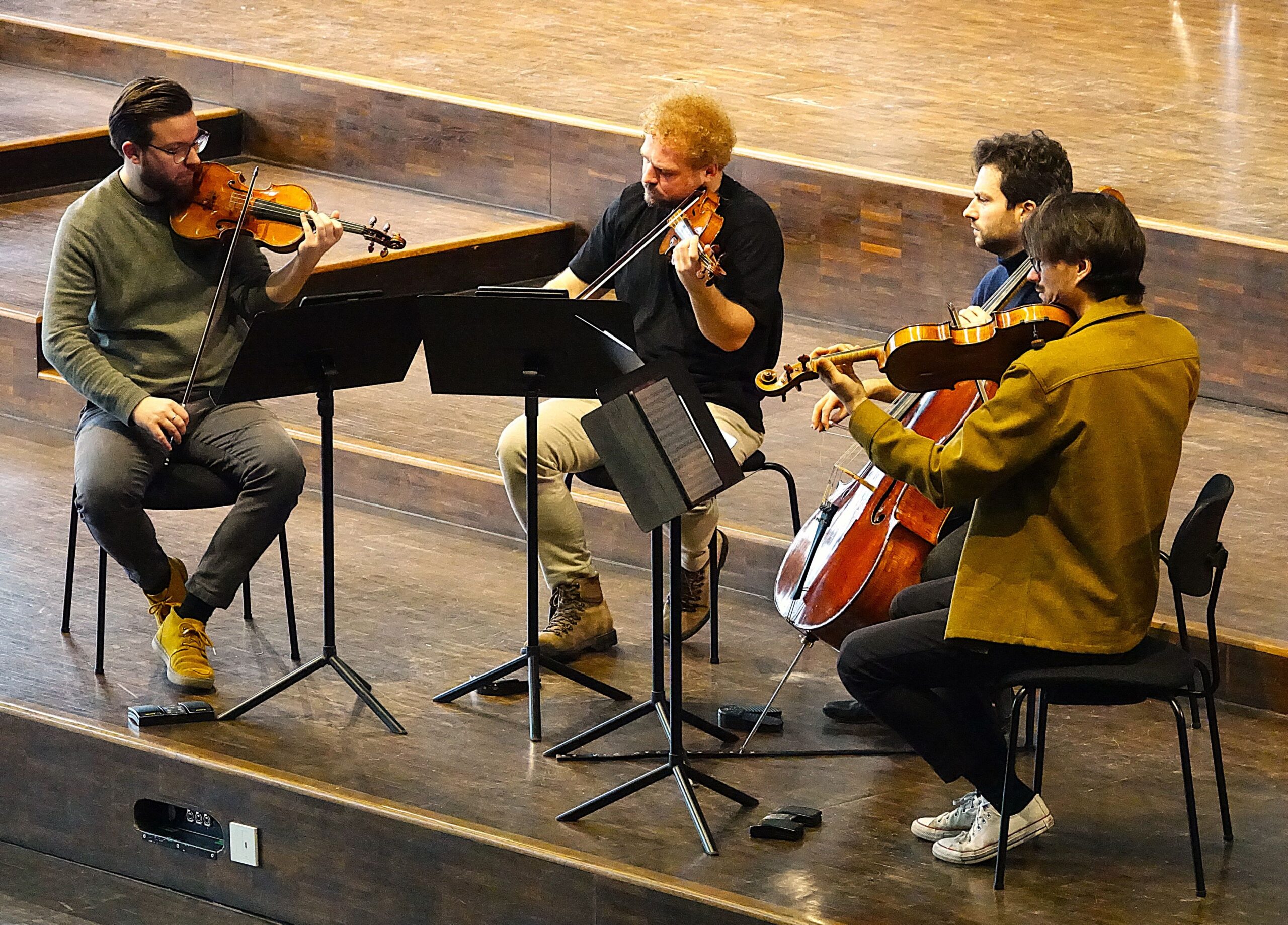 Als die Mitglieder des “Goldmund Quartetts” ihr Ensemble vor 16 Jahren als Oberstufenschüler einer Münchner Schule gründeten, waren sie ungefähr so alt wie ihre Zuhörer/innen beim Vortrag am 11. Dezember in der Aula des Lessing-Gymnasiums.