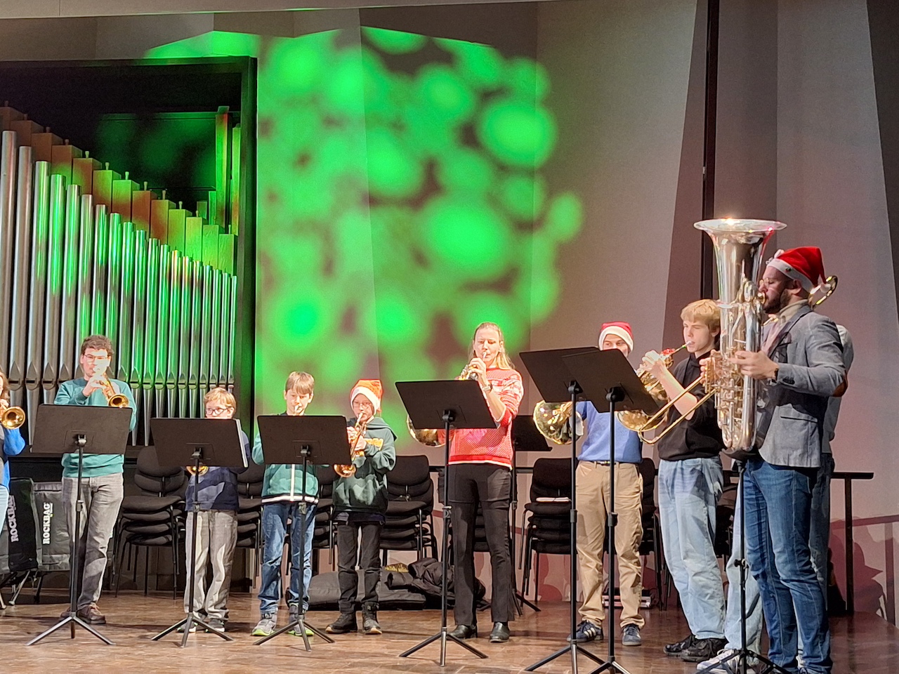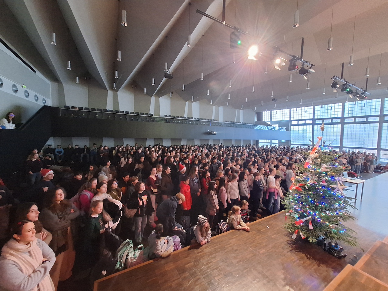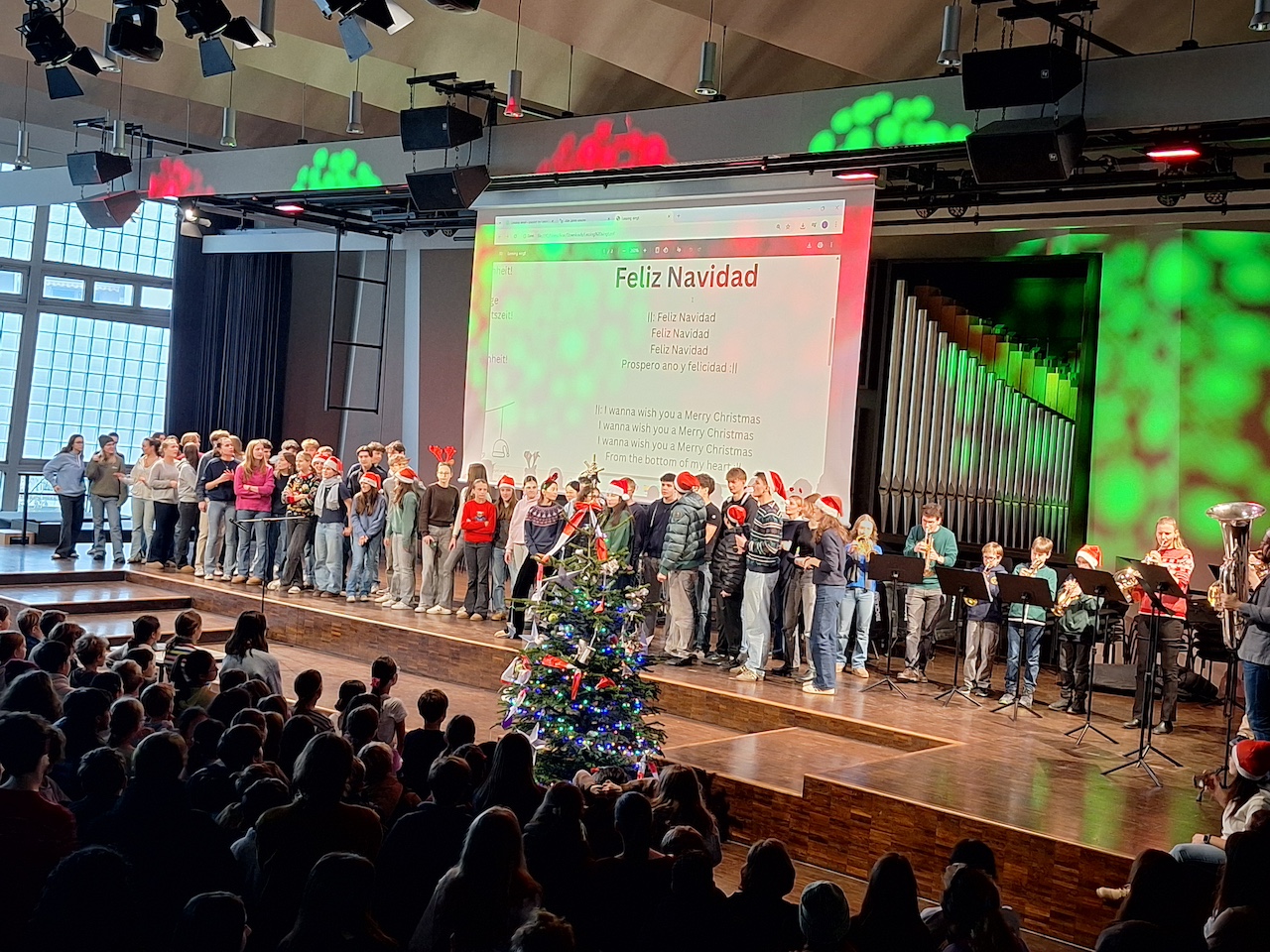 Am letzten Schultag vor den Weihnachtsferien fand wieder das Weihnachtssingen in der Aula statt. Teilweise vom Blechbläserensemble unter der Leitung von Herrn Witzel, teilweise “vom Band” begleitet wurden in der letzten Stunde vor den Ferien gemeinsam Weihnachtslieder gesungen.